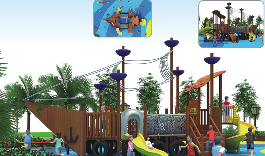 木质组合滑梯,海盗船造型。滑梯、旋转滑梯、网笼组合,色彩鲜艳,造型深受儿童喜欢。适合公园、儿童乐园等场所。