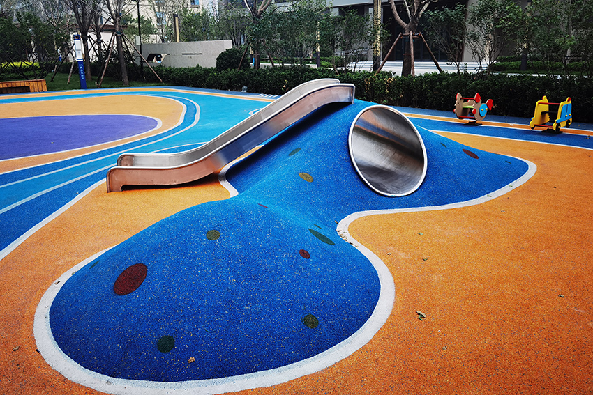 北京亦庄首创远洋禧瑞天著社区的主题乐园位于社区内的中心广场,广场采用橡胶地面,拥有微地形乐园,可以让孩子钻爬,也有滑滑梯,还有动物造型的小滑梯,秋千架,攀爬架等,可以让孩子们自有玩耍。